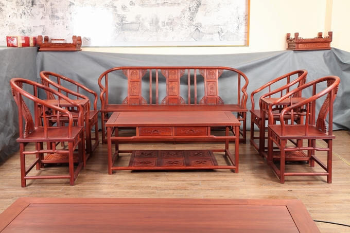 先來(lái)看看單人位沙發(fā)——圈椅,此圈椅沿襲了明代遺風(fēng),總體柔婉流暢的線條,顯露出設(shè)計(jì)者巧思之美;而少見(jiàn)的不出頭扶手直接與鵝脖相卯合,給人以纖秀雅巧的感覺(jué);加上優(yōu)質(zhì)的緬甸花梨木作為用材,使較易損壞的椅圈也更顯牢固堅(jiān)硬,兼具了形態(tài)之美與優(yōu)秀的做工的同時(shí),還擁有著良好的用材,優(yōu)美優(yōu)質(zhì)。雕飾圖案上的內(nèi)容包括有:在靠背板處的上方——一輪外圓框鑲嵌而內(nèi)的艷麗的牡丹花紋飾作為點(diǎn)綴,昭顯著”富貴”與”祥和”之瑞氣;中間位置還有——一株插在瓶器中的花草清野以及一矮小型的長(zhǎng)青株卉,透露出一股淡淡的青草氣息,花香悠長(zhǎng),自然生氣;另外在其靠背板上下的左右兩側(cè)以及券口牙子部分還雕飾有些許簡(jiǎn)單的鏤空紋飾作為處理,給整體營(yíng)造出一種典雅的中國(guó)風(fēng)氣息感受,細(xì)膩而又含蓄。