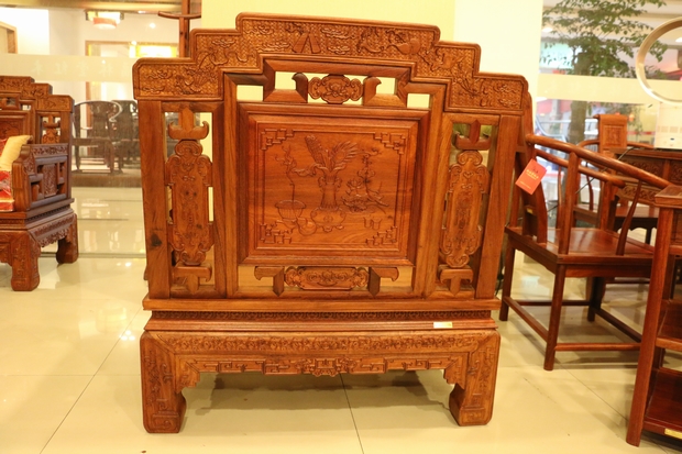 沙發(fā)正上方為一條橫架著的左右兩邊呈三截"樓梯"式樣的長板,長板的正面和背面都刻畫了許多喻示著吉祥平安福到之意的法器寶物,譬如道家八寶中的:鐵拐李的寶葫蘆、曹國舅的玉板、何仙姑的荷花以及藍(lán)采和的花籃等。